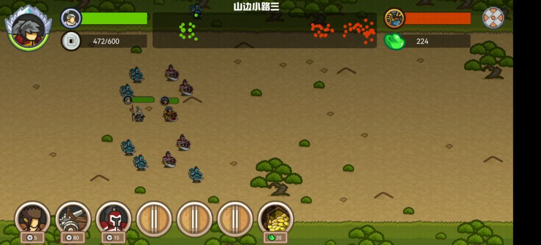 首先是仇恨机制,本游戏的敌人有大概率将仇恨锁定在离他们最近的单位上。其次是伤害判定,本作的大部分伤害为非指向性伤害(打出后不会锁定单位)。结合以上两点,就有了英雄拉仇恨的操作,具体操作为:将英雄放于屏幕中心的上方(后面会讲为啥要这样做),在敌人即将打出伤害的时候进行♾️型路线的走位,熟练运用即可大量规避敌方伤害的同时将所有怪的仇恨吸引在自己身上,为后排提供安全是输出环境。第二点是兵种选择。主要输出就是投石车(无差别aoe打击完美应对本作大量堆怪的特点)。其次是5块的刀斧手(弱小的前排单位,但在普通难度下是十分优质的炮灰,能保住80块的大爹投石车就是胜利)。最后是15元的盾甲兵(此兵种只对想要挑战“艰”难度的玩家推荐,在“艰”难度下,敌方得到了大幅增强,5块的刀斧手已经不能活着走进战场中心阻挡一下敌方的脚步了,故只能将前排的重任交给单体血量更厚的盾甲兵)。