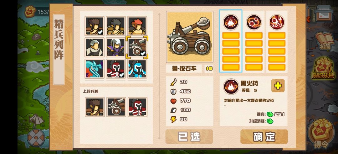 选中的兵种从左到右分别是刀斧手 投石车 遁甲兵