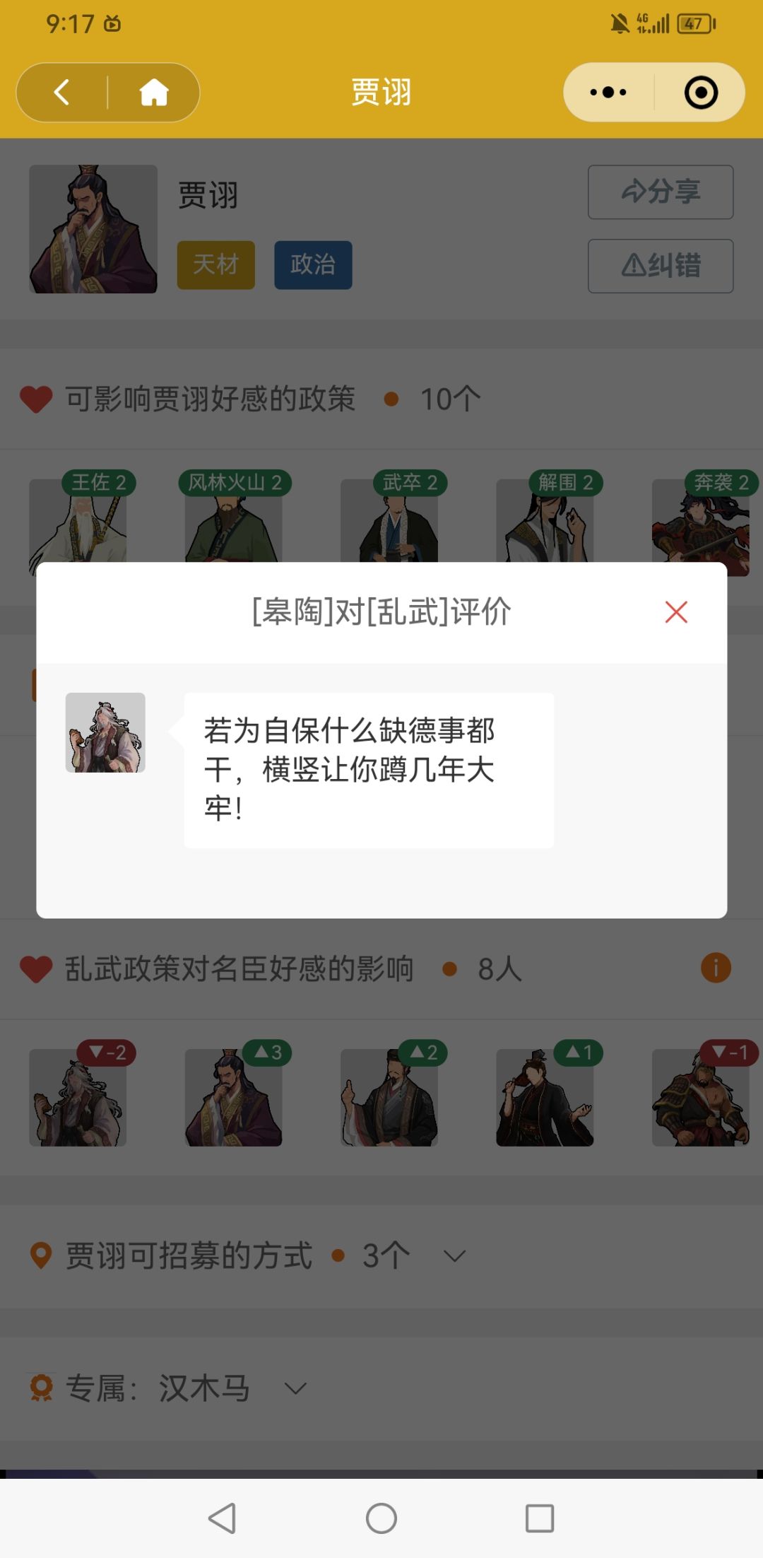 顺带一提,现在【无悔营地】更新了名臣政策的评价语,类似底下的皋陶对于贾诩乱武的评价,所以也欢迎使用微信小程序【无悔营地】来进行查询~