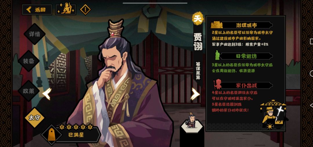 也许是因为本身政策过于优秀,导致贾诩的太守显得非常鸡肋,本身并不出色的粮食产量效果配上军事建筑,让贾诩太守显得毫无意义。
