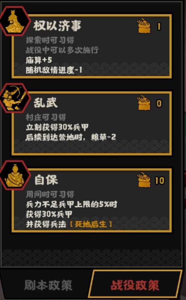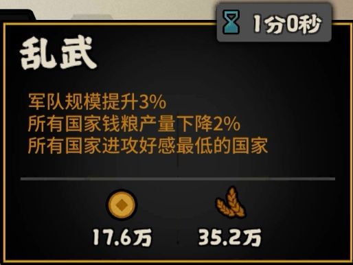 但是由于一来之前的剧本不像三国对垒战,直接放弃就能被灭掉,如果遇到初始耐久比较高,可能要被打两到三次(但是乱武的冷却在非限制循环的剧本太久了)。二来除了乱世小国家,如果选的一个势力有两块以上的地,开局为了这个政策硬等乱武都是挺浪费时间的事。