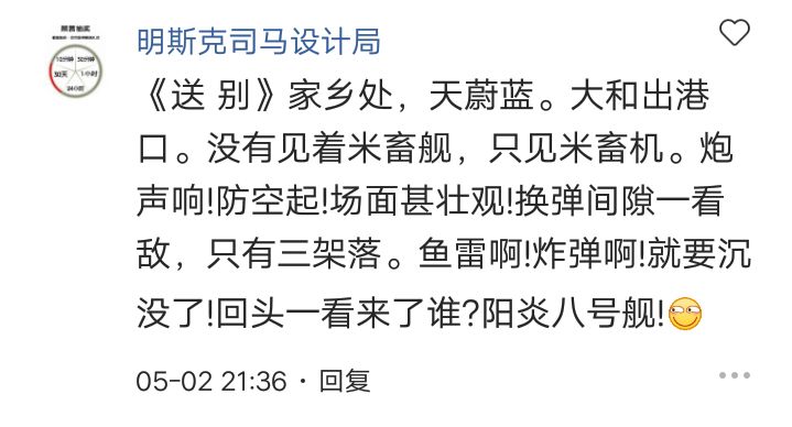 长门外 天城边 出云烧成仙 信浓改航出港沉 武藏炸成片 大和沉在冲绳外 飞机飞满天 一看海军还剩谁 阳炎八号舰