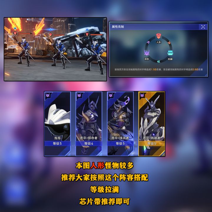 本图的怪物属性多为人形,固推荐各位开拓者用扑满+掠夺者+抹消者+践踏者,这个阵容刷怪怎一个“快”字了得。
