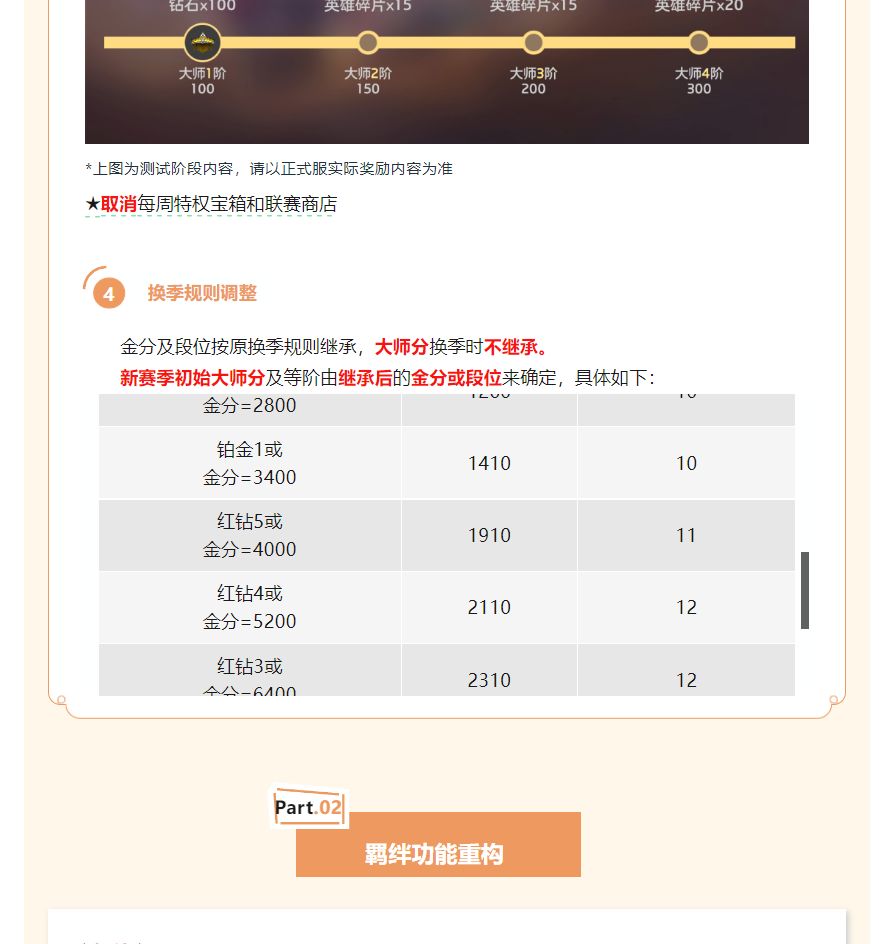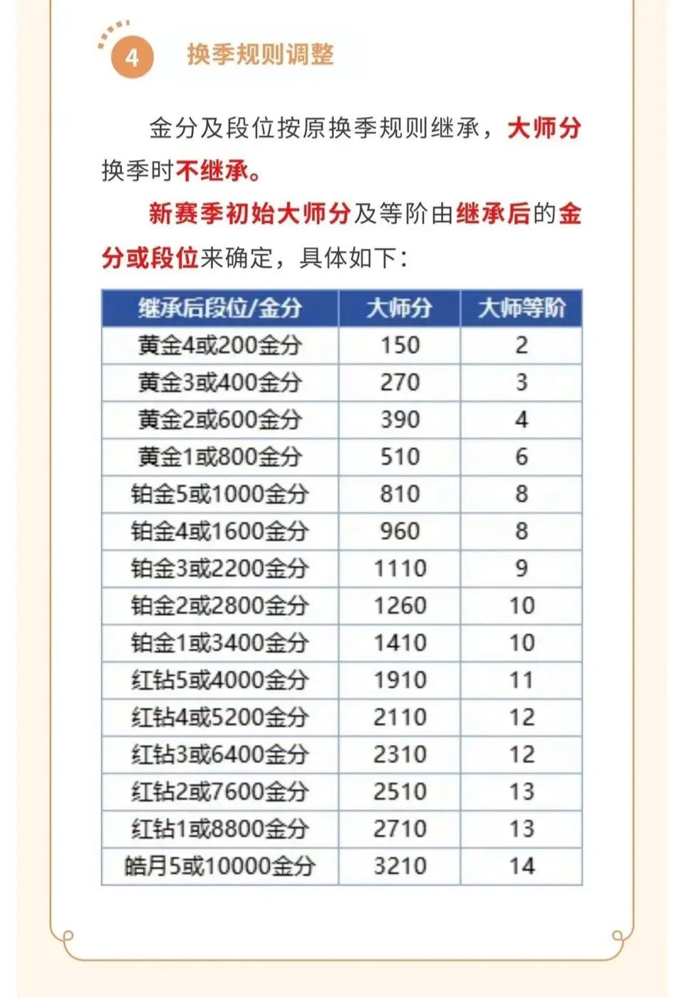 换季规则调整金分及段位按原换季规则继承,大师分换季时不继承。新赛季初始大师分及等阶由继承后的金分或段位来确定,链接具体如下:
