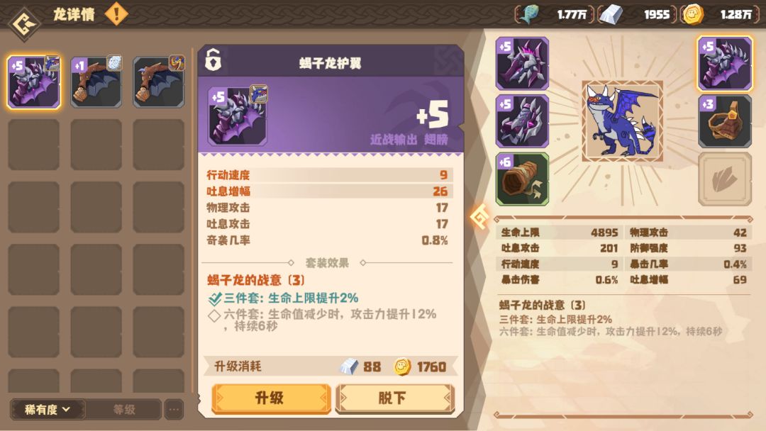 如果想要进一步提升龙伙伴的战力和存活能力,可以通过给龙穿装备来实现。在每条龙的详情页可以看到龙穿着装备的情况,还可以通过消耗葛伦科钢来给装备升级,获得更好效果。葛伦科钢可以通过分解装备或任务奖励获得。特殊装备会有套装效果,根据套装效果把装备分配给合适的龙伙伴吧~