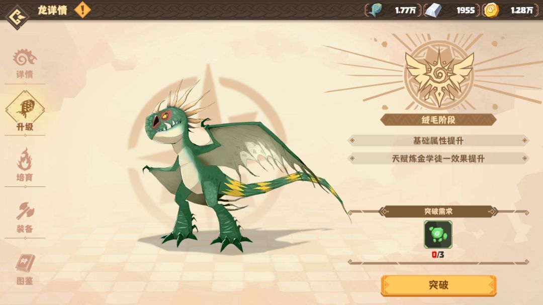 龙伙伴成长的过程中会有不同阶段,当升级到一定等级时,会需要特殊材料精粹琥珀来帮助龙突破界限、继续成长。龙的属性不同,所需要的精粹琥珀的属性也不同。例如,自然属性的龙,只能通过自然精粹琥珀来突破。而精粹琥珀则需要各位龙骑手在铁匠工坊中制造,安排合适的龙陪同制造有概率获得双倍产物哦!
