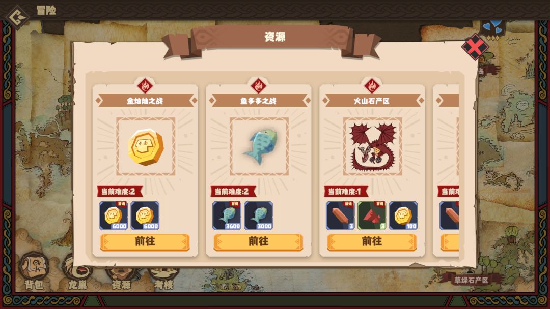 在冒险地图上,除了主线探索副本之外,还有可以产出资源的资源副本。资源副本不仅能产出各个属性的琥珀和矿物,还能产出金币和肥美鲑鱼。当各位龙骑手金币和肥美鲑鱼不足,小屋生产又不够使用时,就可以通过资源副本来获得大量金币和肥美鲑鱼。