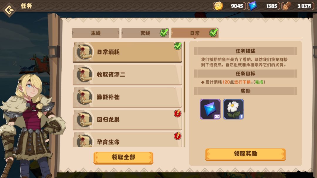开荒前期材料不够?推荐多做任务!七日重建博克岛任务奖励丰富,各种资源绵羊都有,还有鱼脚司的信物可以领。每日任务每天6:00刷新,0点过了也不用怕~支线任务陪伴各位龙骑手一路成长,完成任务即可领取奖励。