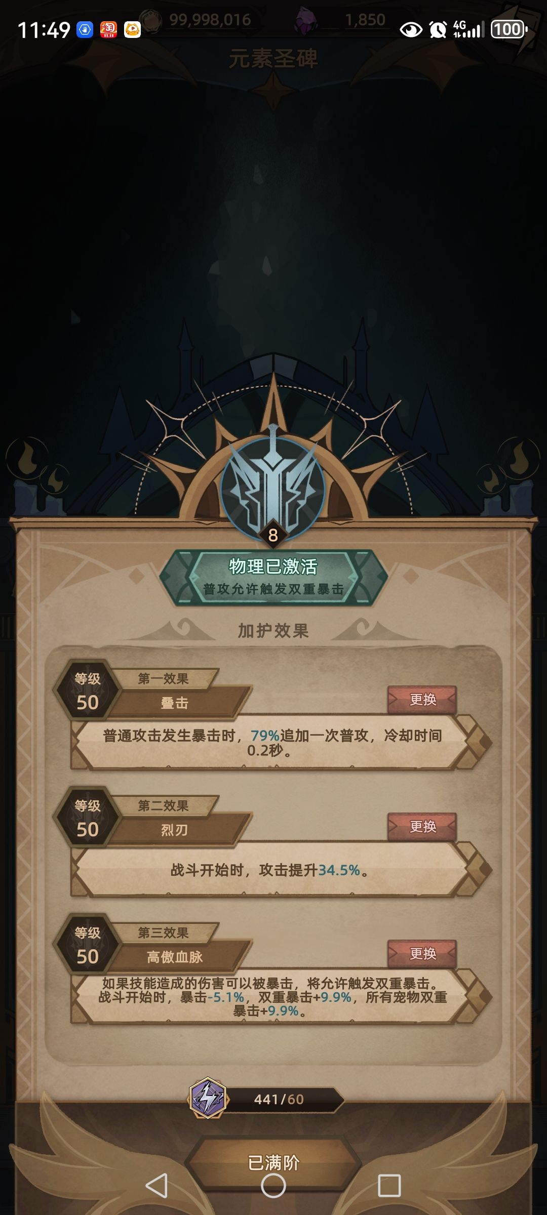需要刷各个的元素徽记进行升级,每个元素总等级8级,可以装备3种效果,每种效果满级50级。