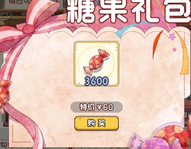 1、每次进入糖果商店都会弹出糖果礼包,这个礼包梦梦是不建议大家买的,糖果礼包的售价为60米3600个糖果,但是大型糖果礼包则是128米9600个糖果,相比之下这个的性价比是会大打折扣的,而且3600的糖果也不能够去拉开很大的距离,所以梦梦并不建议购买;