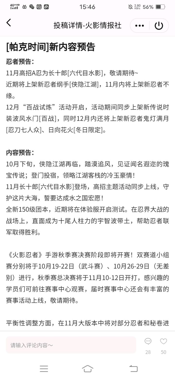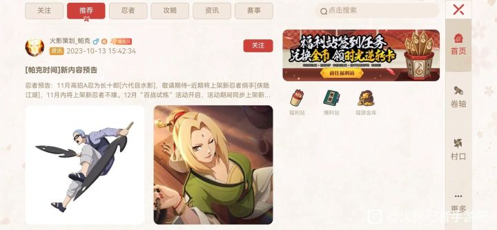 十一月月初或月中高a长十郎,下周左右开始侠隐纲手活动,298加强,漂泊超削弱,冬日花火(应该是博人传?)冬日红豆削弱,十二月水门及皮肤上线