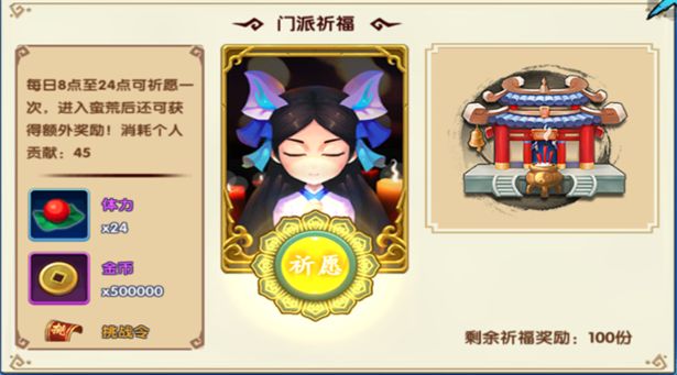 ③门派祈福,这需要玩家先加入一个门派,在门派里面玩家每天8点到24点可以进行祈愿,祈愿后玩家会获得体力金币挑战令。
