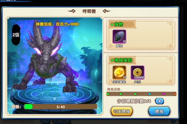 ④门派神兽阁喂食,门派神兽相当于门派吉祥物,这个吉祥物需要门派玩家的喂养,当然神兽也会给玩家一些喂食奖励,金币就是其中的奖励。