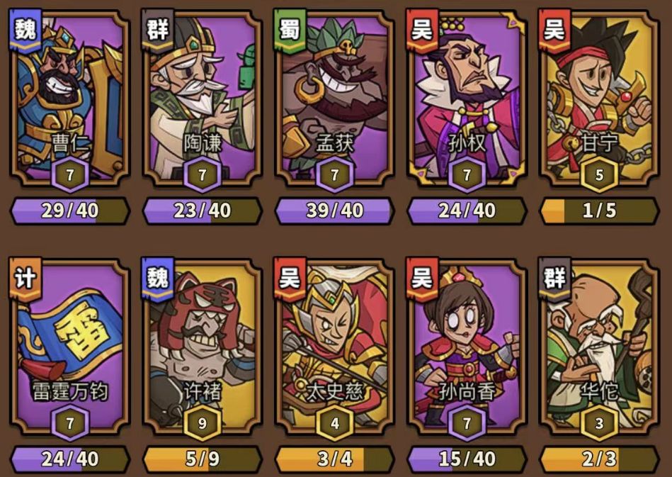 开局阵容:孙权、孙尚香、太史慈、陶谦、孟获、华佗(三吴、华佗刷不到可以不升满,陶谦、孟获升满级)