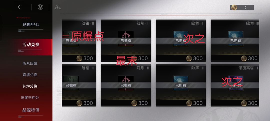 复刻烙印优先兑换狂欲之城,其余换独舞和高塔,最后酌情兑换幻月和箴铭,本人建议优先箴铭。