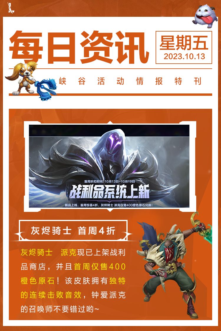 最后别忘了灰烬骑士 派克首周4折的超值优惠!这款拥有独特连续击败音效的皮肤已上架战利品商店,首周仅需400橙色原石,爱玩派克的召唤师不容错过!送水晶秘钥*10的活动也已开放领取,召唤师记得进入游戏领奖哟~