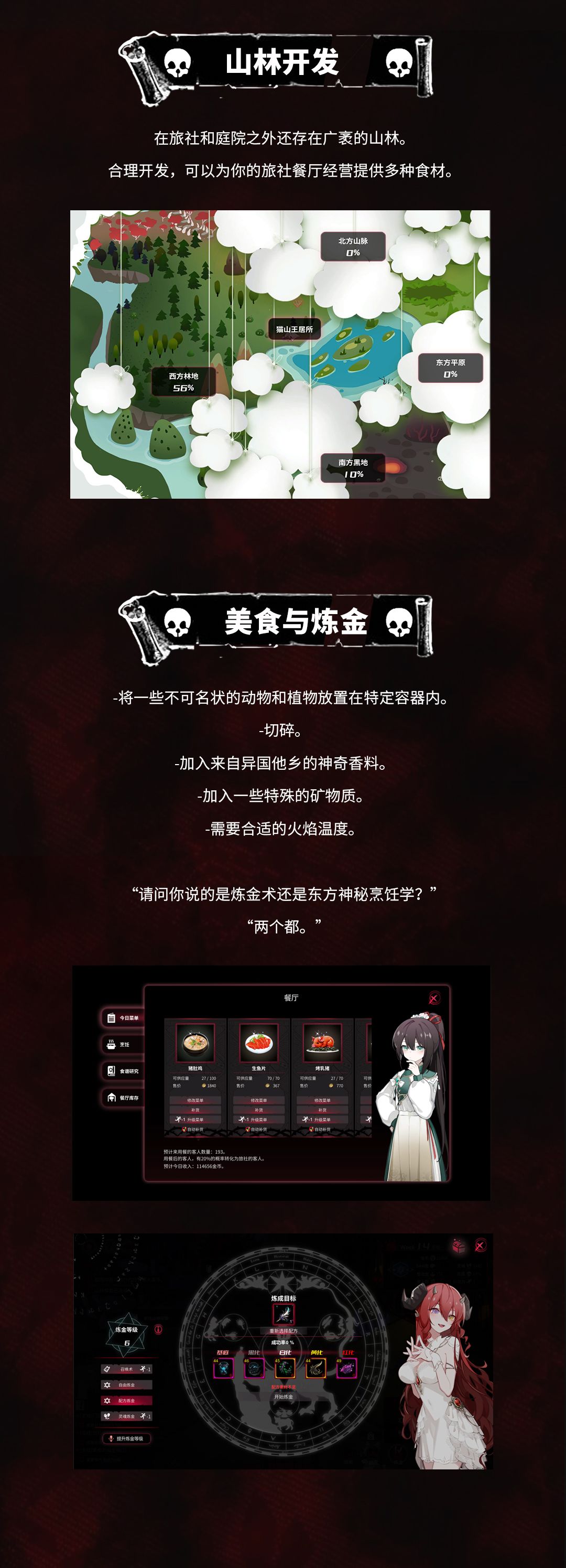 《犹格索托斯的庭院》是一款黑暗幻想模拟经营AVG游戏,如果你喜欢AVG又喜欢模拟经营,那一定不要错过。在这款模拟经营+AVG游戏中,你继承一座荒废已久的别墅并欠下黑暗债务。你将招募死神、龙族、斩灵师、人造人等员工开展旅社经营。奇怪的客人将带着神秘事件到访。你会通过挖矿,冒险,炼金,经营餐厅等不同策略积攒资产,不断调整策略,带领旅社走向不同结局,另,员工可攻略。