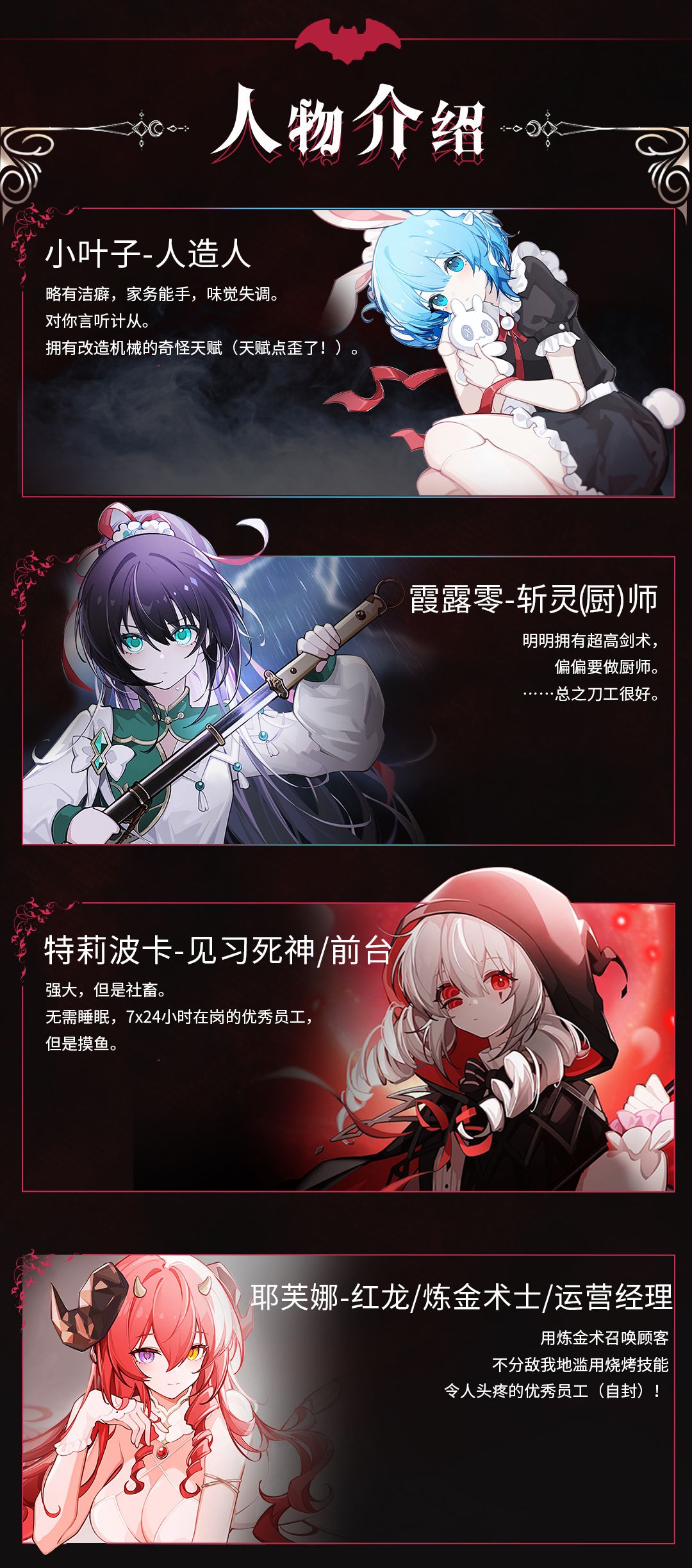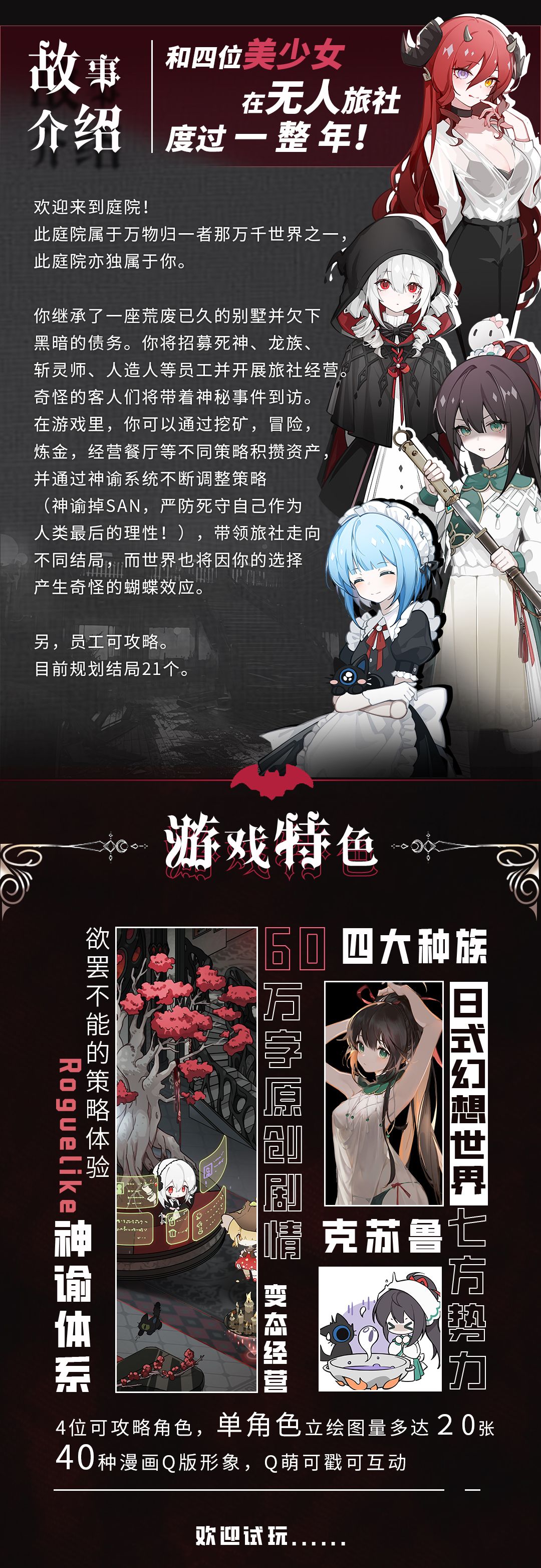 游戏拥有克苏鲁+日式幻想冒险世界观,60万字原创剧情,40+独立形象角色设计,四大种族,七方势力,4位可攻略角色,单角色立绘图量多达20张,打造一个日式黑暗幻想世界,据测试玩家估计,游戏时长约为20-30小时,目前Steam页面有demo可以免费试玩,demo仅仅为2月份的版本,体量也仅有正式版的约1/6。
