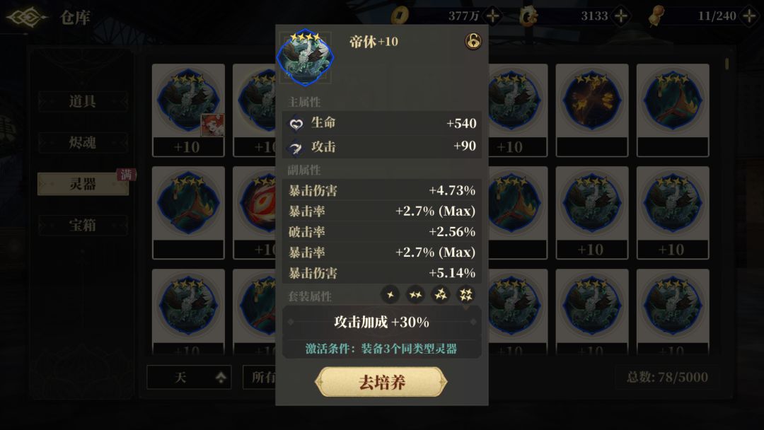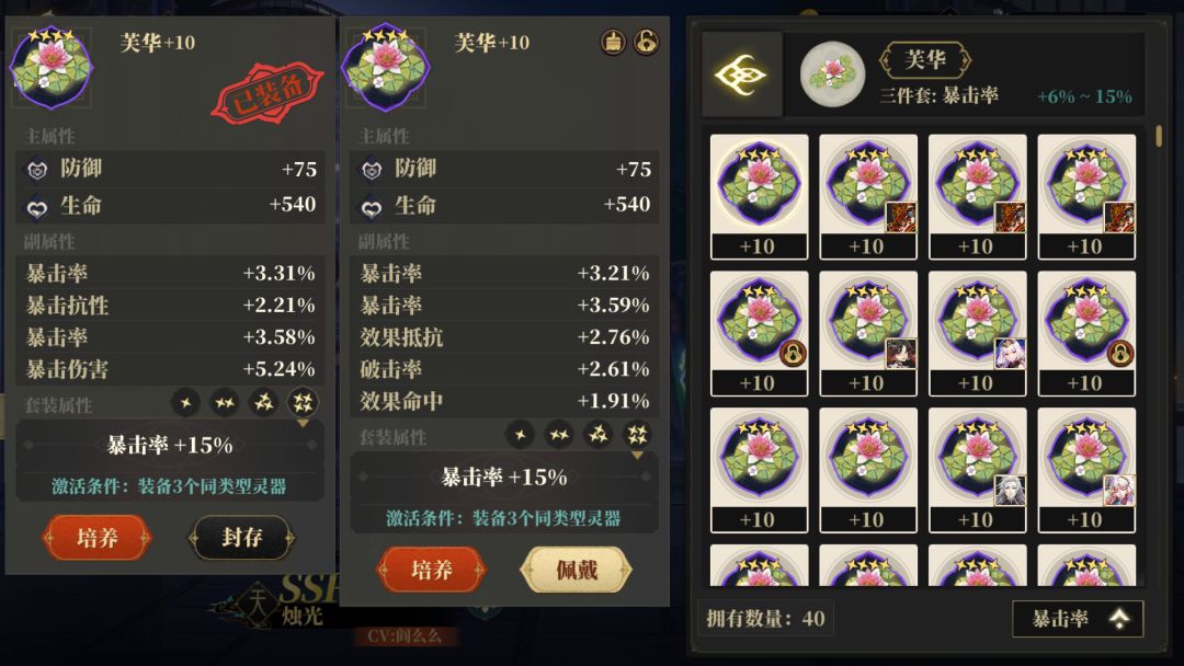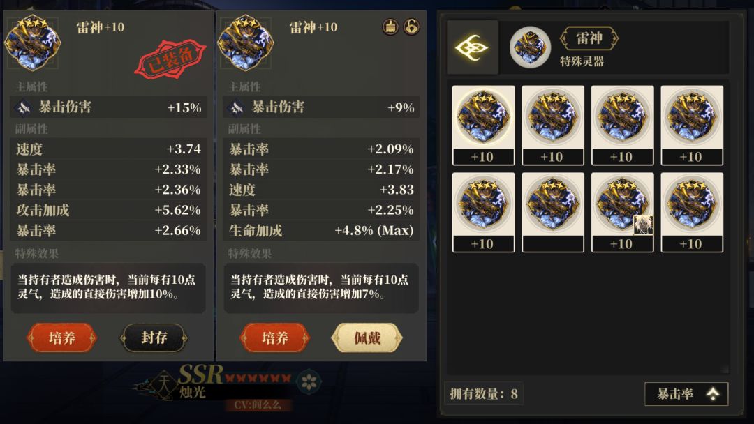 1、灵器天、人暴击率最高2.7%,和为3%,地最高3.6%。所以地这个位置要求最少六个6个暴击率,虽然这个位置也有破击强度套装,但破击强度可以靠其他位置堆,唯有暴击率只有这个位置是最高的能有6.5%x3最少34%的暴击率。这游戏的c你可以没有攻击没有暴伤,唯独不能没有暴击率,毕竟白板谁都有,看的就是谁暴金暴的高。