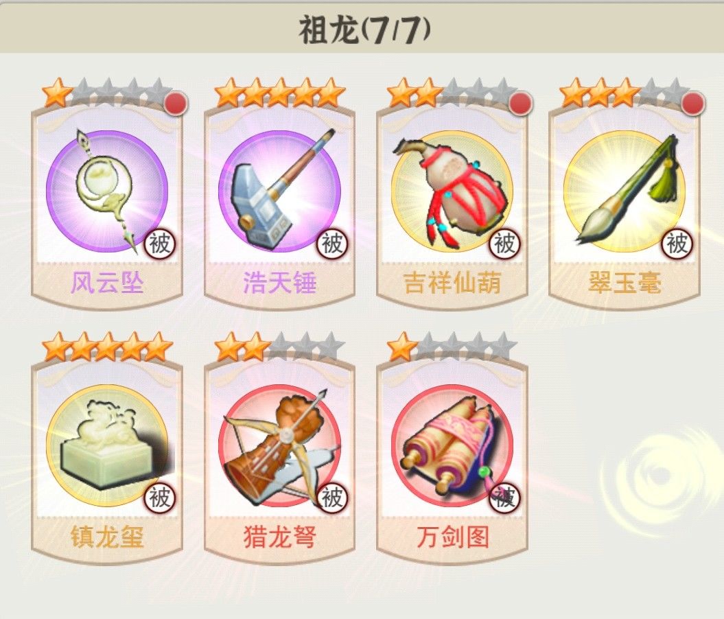 镇龙玺的主要来源,虽然有3个金色法宝,但镇龙玺的爆率是最高的,哪怕在福源较低的情况下也可以开到不少镇龙玺,祖龙系列在福源较低的时候也可以开,当然福源低的时候开到的猎龙弩和万剑图会比较少,但是主要还是为了镇龙玺,至于红色法宝当附带就行了,大多数都是镇龙玺8星或9星就不开了,以后福源高了再开这个箱子也可以,因为猎龙弩和万剑图的爆率都很正常。