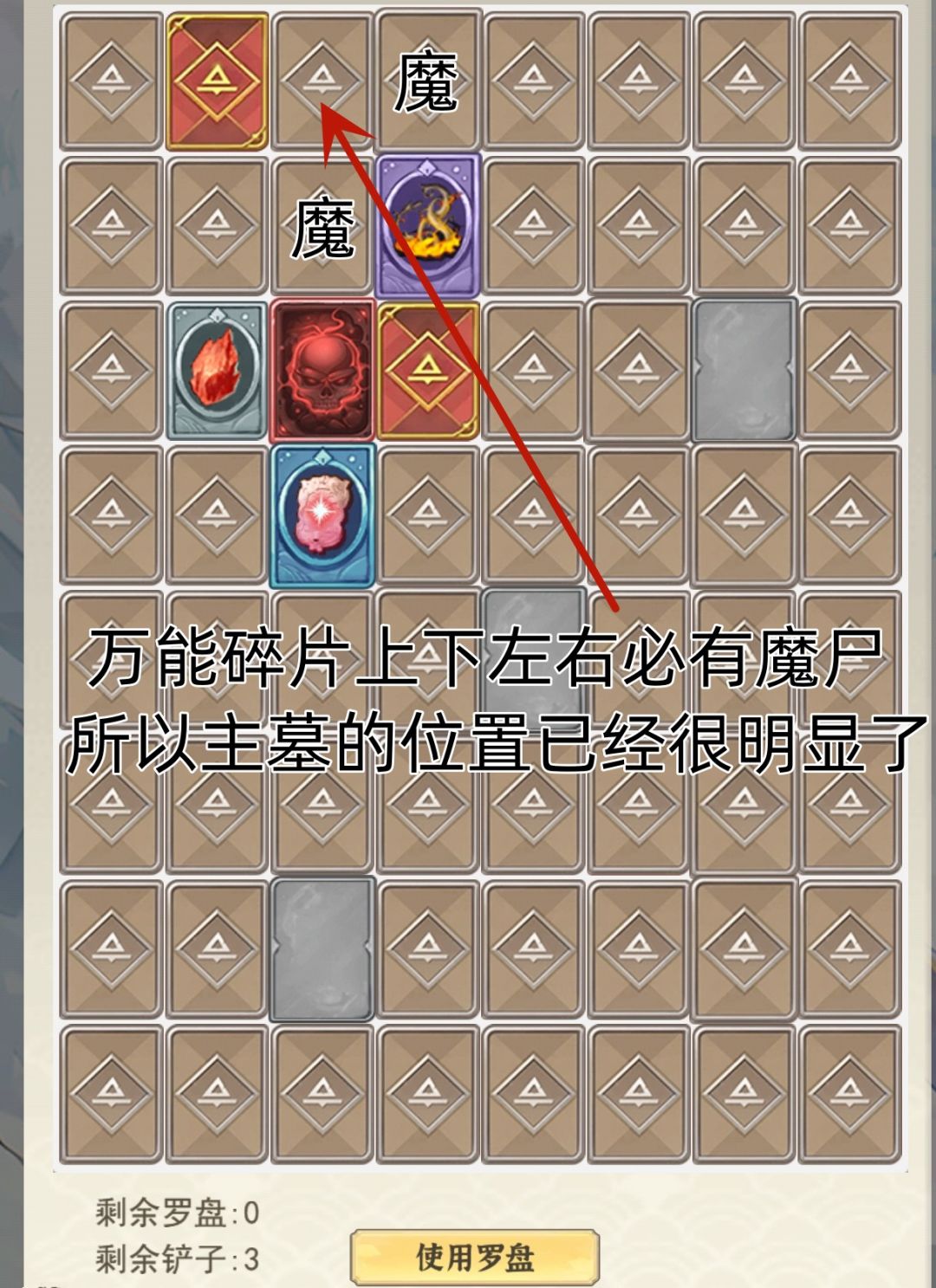 仙魔冢可以拿到仙体的升星材料,具体玩法点说明那里先看看,万能碎片和主墓的上下左右必定会有魔尸,有的主墓在边缘,所以边缘外的魔尸是看不到的,开局直接乱翻几个牌子,翻不到东西再用个罗盘,使用罗盘后的黄牌子就是魔尸,所以在黄牌子的左上和右下翻牌,如果是空墓穴或者材料,那么主墓不在这里,翻到魔尸的话主墓大概率就在旁边了。