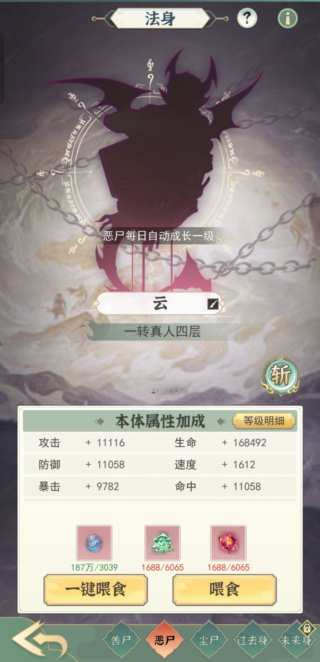 在灵界洞府的法身里解锁,每天自动提升1级,升级用的材料是通天塔产出的,考虑到恶尸每天增加1级,在等级高了后就别用材料升级,让它每天自动升级,材料都屯起来,等到满级后就斩掉,因为有提前屯材料不至于直接掉几千万,红晶石也可以兑换通天塔扫荡券。