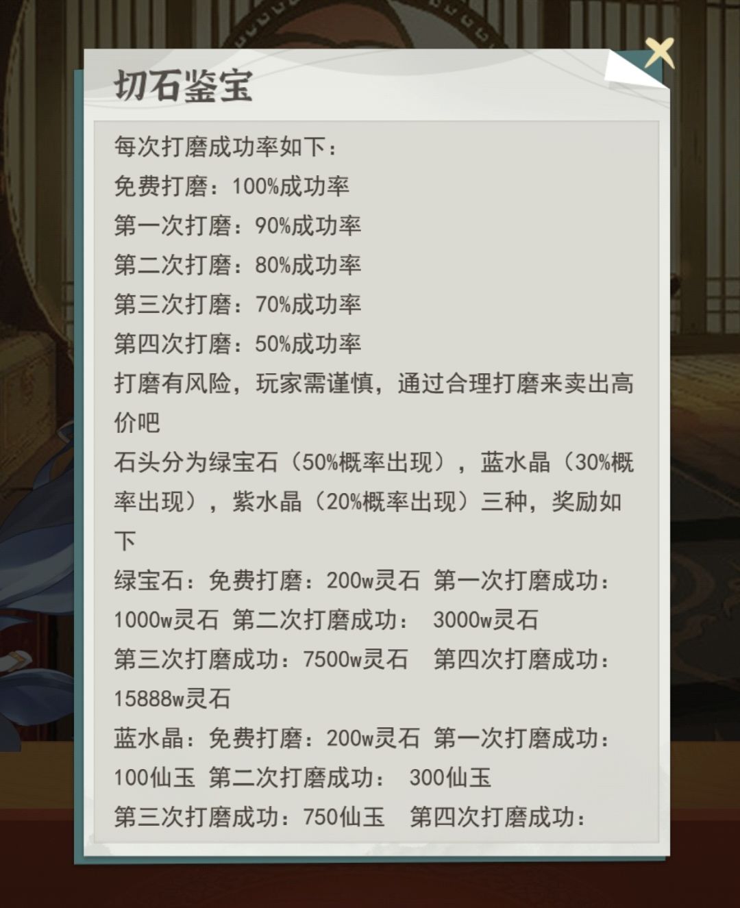 简称赌石,一共有3种石头:灵石 徽记 仙玉。