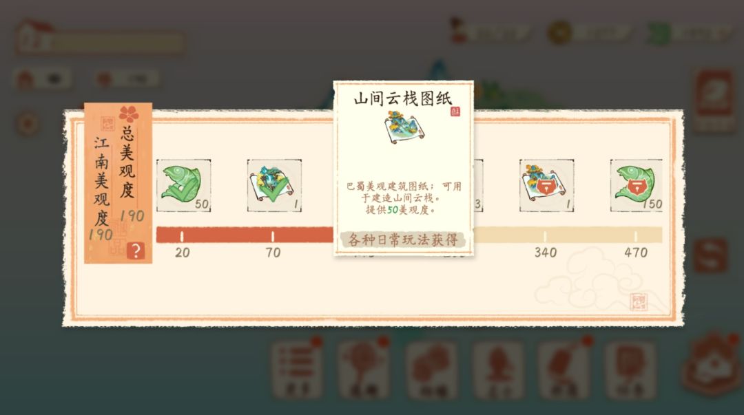 当总美观度达到一定进度,即可获得“山间云栈”的图纸啦~