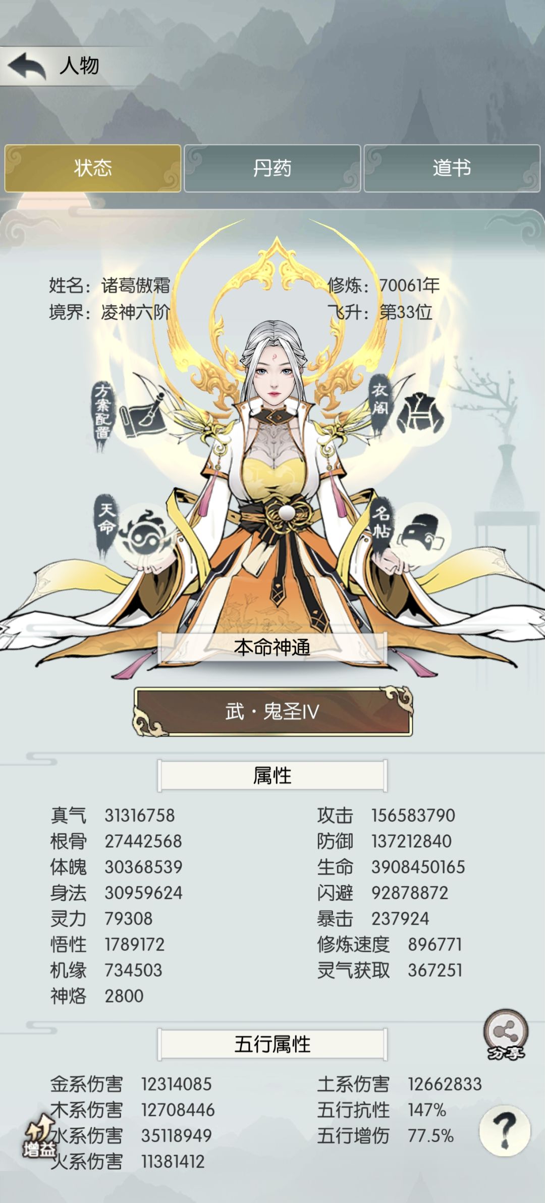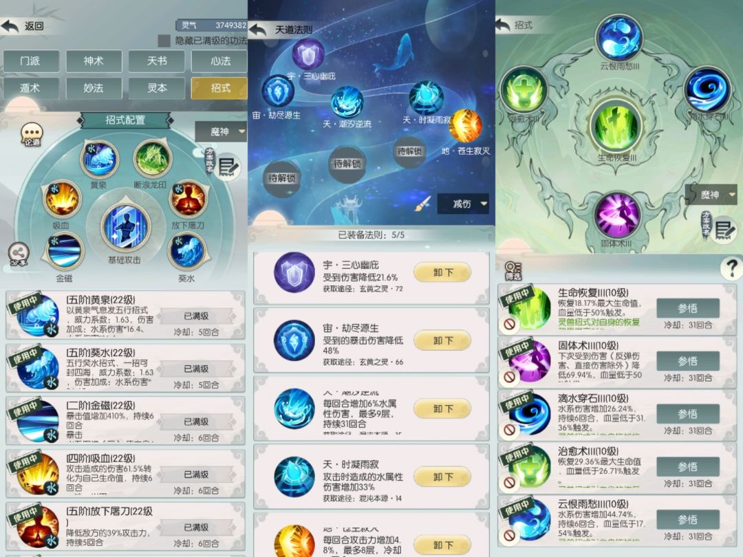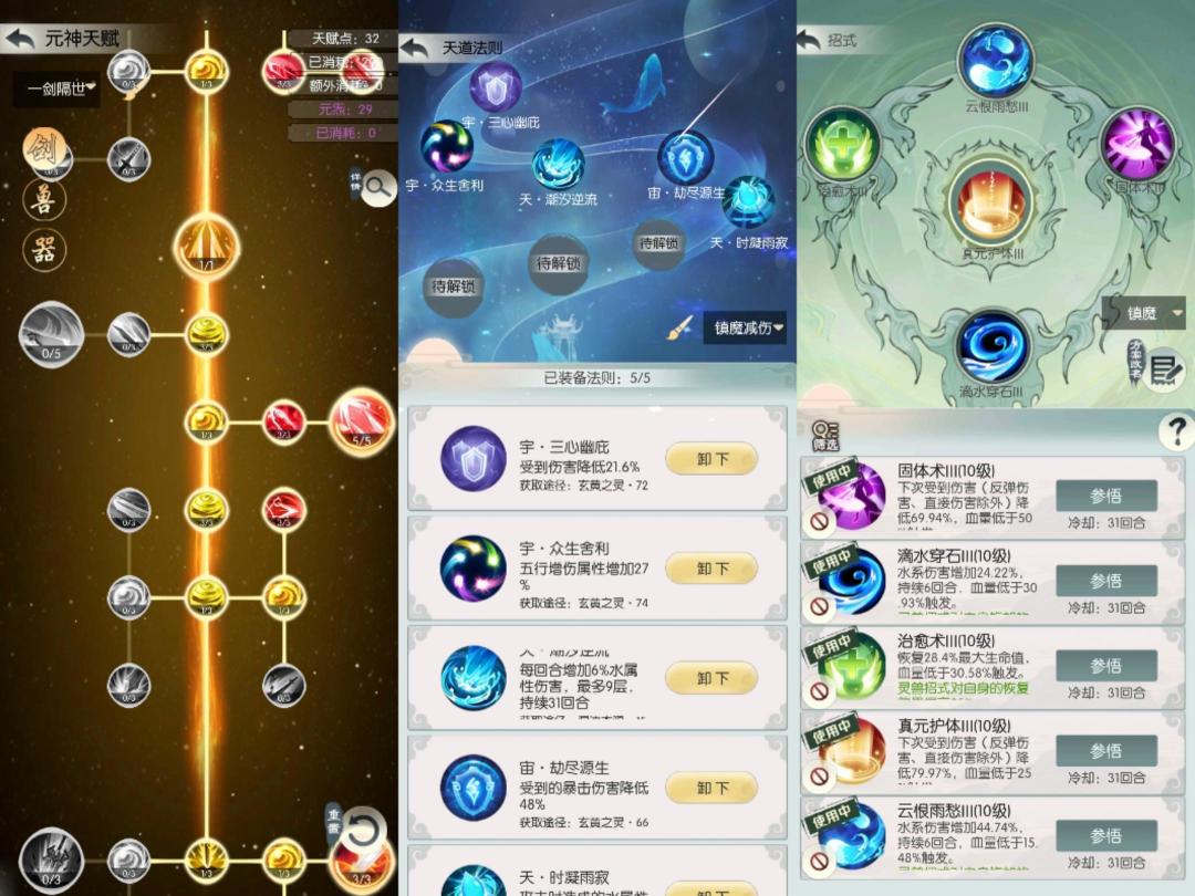 打 4-1 放下屠刀可以换成一个副五,金磁、血炼打上图谱增伤,四输出概率大点。实测踏天境界 3600 主五只要运气不是太差,多打几次就能过( 24 回合左右胜),血量最好有 35 亿左右。神通鬼圣、圣躯 4 后羿 2 女娲 或 4 女娲 2 后羿(神烙低于 2500 的话),天赋后发主五➕剑右六道无我剑,法则如下: