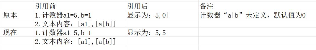 在计数器引用的时候,我们会使用[]来将文本中的计数器转化为所代表的数字。原本在进行括号匹配的时候,左括号[会直接和最左边的右括号]进行匹配,无论这两个括号之间有多少个左括号[,在这一左一右两个括号内的一切文本皆视为某个计数器的名字。而现在,右括号会与最近的括号进行匹配。举个例子大家就明白了: