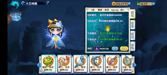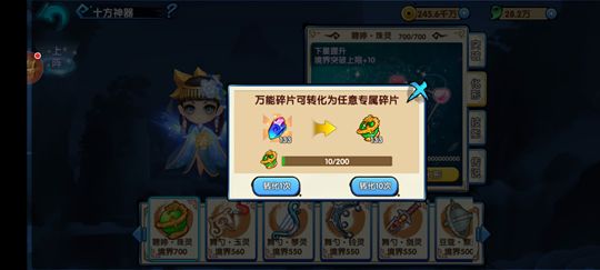1:万能石兑换可以转化为任意专属碎片,可以突破后十方神器会化形,都会有一个可爱的灵宝,会消耗金币和可神器灵气,升级越高消耗越多,可以升级到860级。