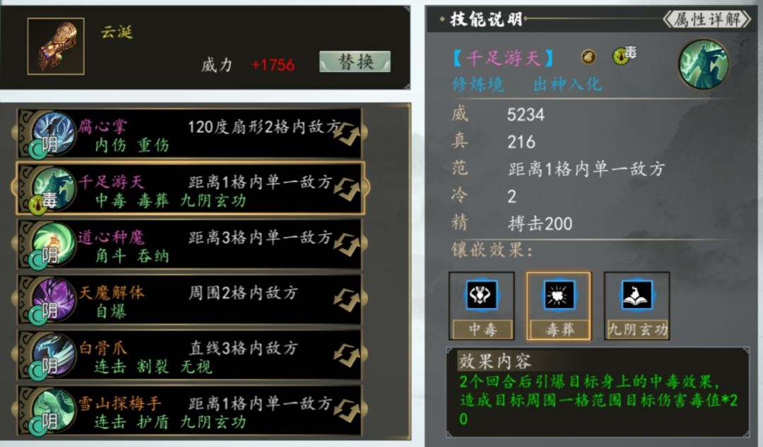 4、不知道是因为半成品还是刻意为之,毒属性的高级招式非常的敷衍,所有招式面板数值是一样的(威力、真气、范围、冷却),区别只有招式附带的镶嵌效果不一样,具体可以参考上面暗器毒招式的图。