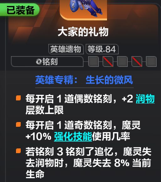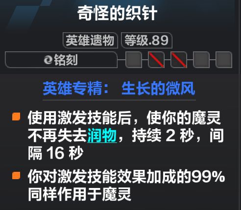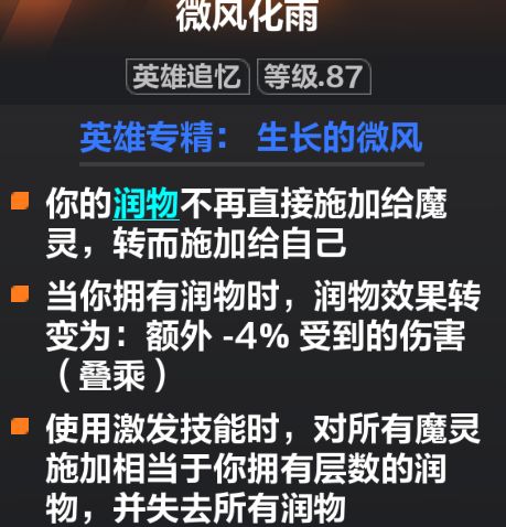 这条路线(大量减少失去润物的几率)可以使用英雄追忆微风化雨来保命,叠乘的效应非常大,最基础的12层可以减伤效果也非常非常大4**12=16777216,但是使用激发技能后就会失去效果。路线二(大量增加润物层数)也可以考虑使用,不过魔灵的润物层数掉落速度非常快