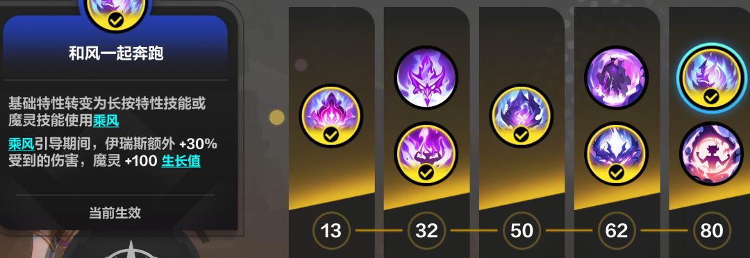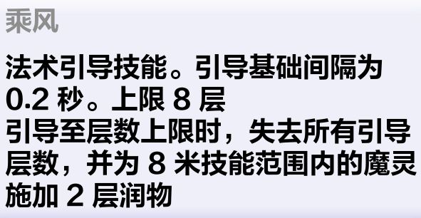 乘风:法术引导技能。引导基础间隔为0.2秒。上限8层引导至层数上限时,失去所有引导层数,并为 8 米技能范围内的魔灵施加2层润物