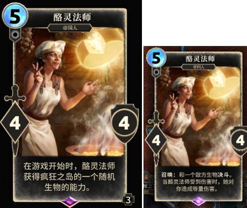 在对局开始时,每一张“酪灵法师”获得随机的卡面描述并在你的卡组内固定下来,此处截图为“酪灵法师”获得了《疯狂之岛》扩展中“麻烦探寻者”的卡面描述。