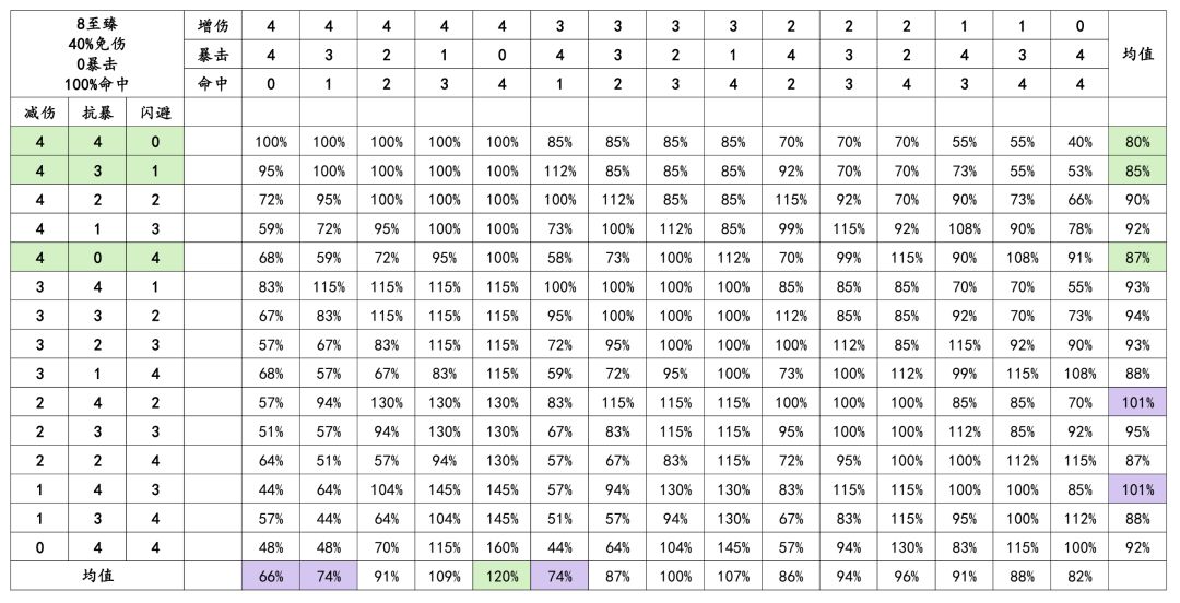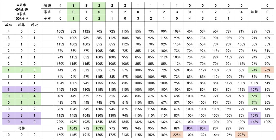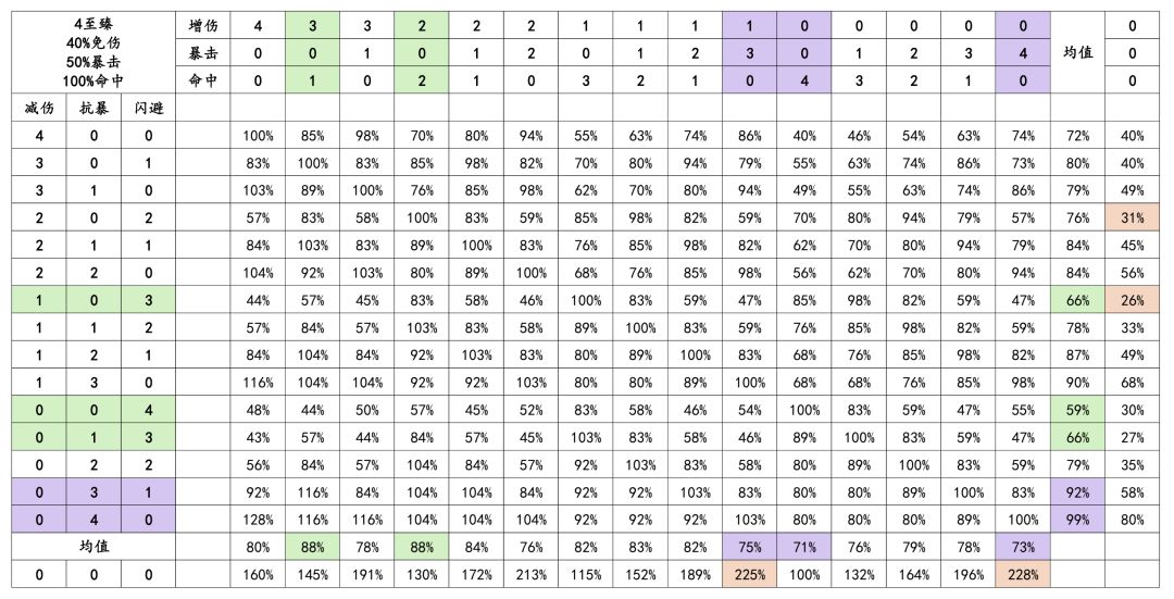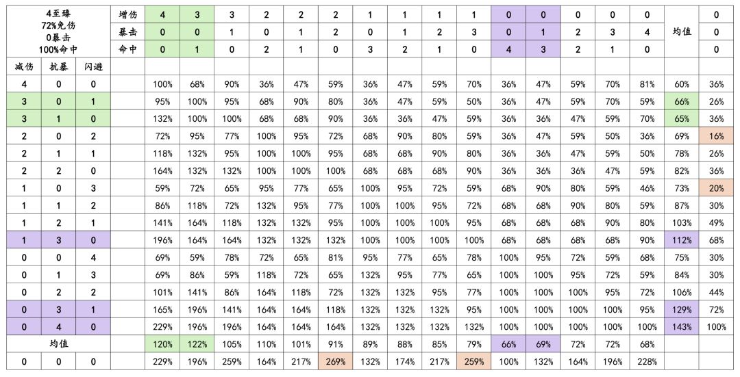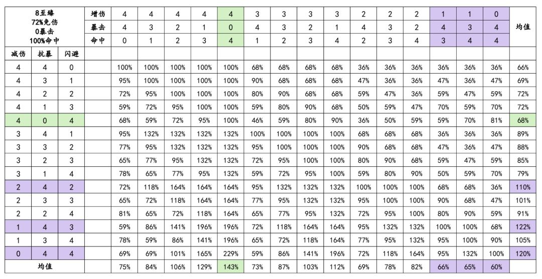 结论:受击方4减伤+4闪避收益比较大,进攻方4增伤+4命中收益比较大,当然实际情况会有出入,自行看图即可,下面几张图不再赘述。图中紫色代表不推荐,绿色代表推荐,依然是自行决定。