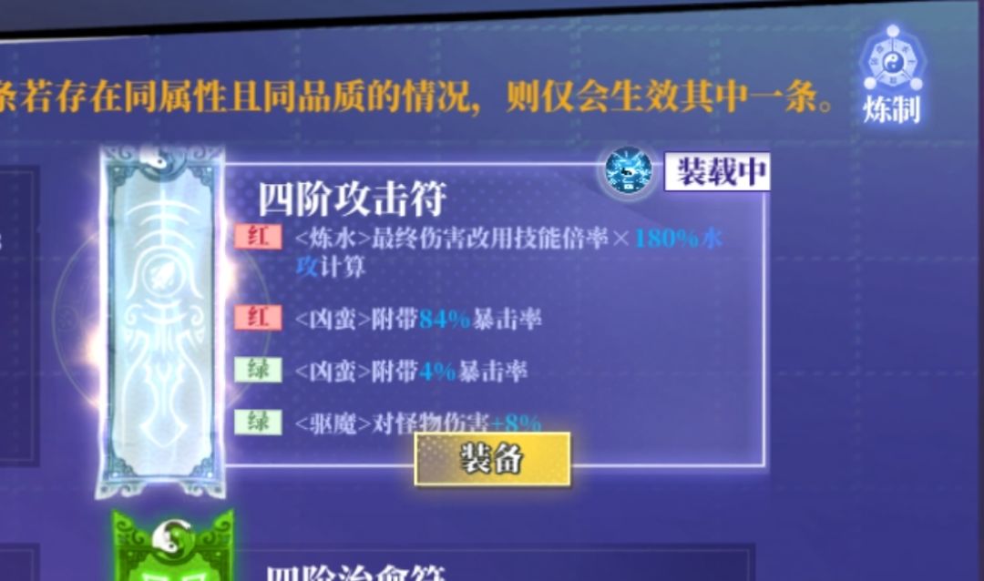 玉和符的极致(一般人是搞不动的×)需要时间,运气与材料缺一不可,注意:除了愈伤(一种流派)外,其他对于暴击率的获取都可以用符上的红色属性“凶蛮”(增加84%暴击率)替代,愈伤吃不到凶蛮所以需要在装备和玉上面下功夫,一般来说有一个凶蛮和一个炼X就行了,x指的是你所玩的流派,玩水就是炼水,玩防就是炼防