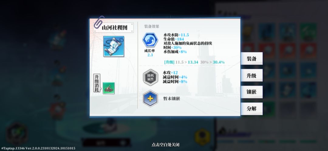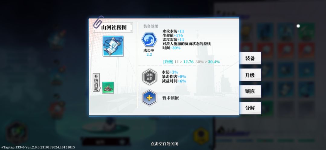 装备分为基础属性+基础技能+附加属性,附加属性是随机的,且可以附加到基础技能中,也就是通俗说法中的升级,且一般来说装备会带走不同的装备效果,如下图中的山河社稷图,要记得根据自己的流派选择适合的属性