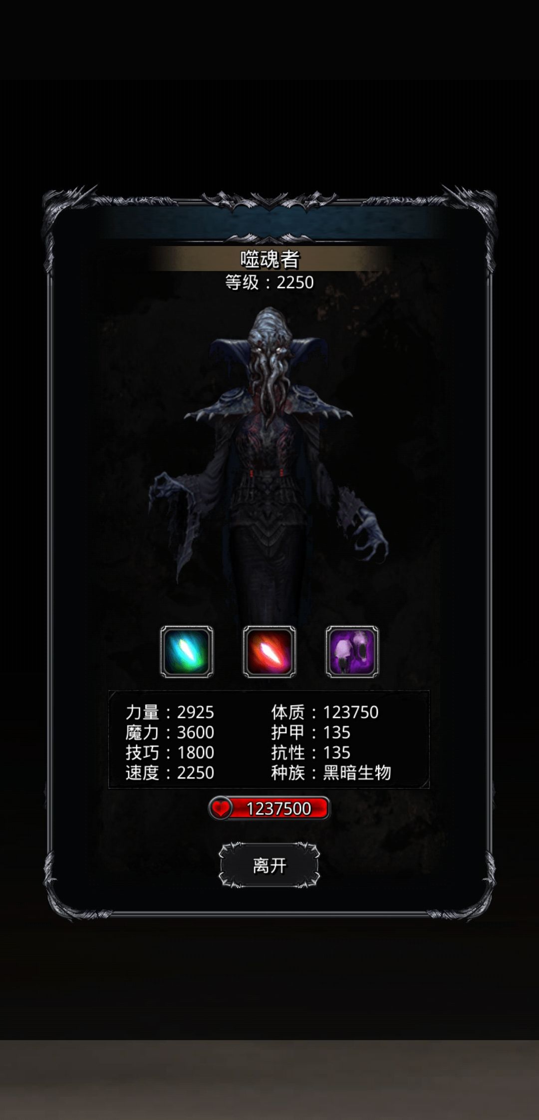 三个技能:1.群体魔法伤害36,200%附加15000的夺魂。2.群体魔法伤害93600(一定暴击,暴击伤害140400)。3.免疫晕,重伤失效。
