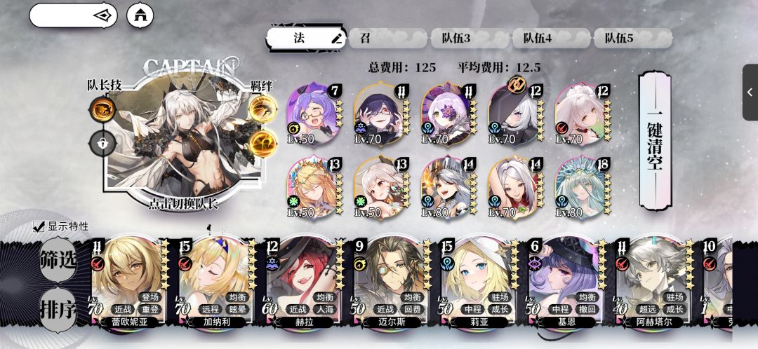 4.编队方面的话 理论上 满足队长技能的情况就可以了(也就是5个对应职业的角色+队伍平均费用要求) 然后回费(领航)必备 奶(部分支援.也就是莉莉和诺拉)看情况带(其实一般可以不用带.除非关卡有的需要保证队长血量的可以带一个稳妥一点) 主要其实还是根据难度和怪的特性来灵活改变摇摆位(非满足队长技能的队员都可以是摇摆位)