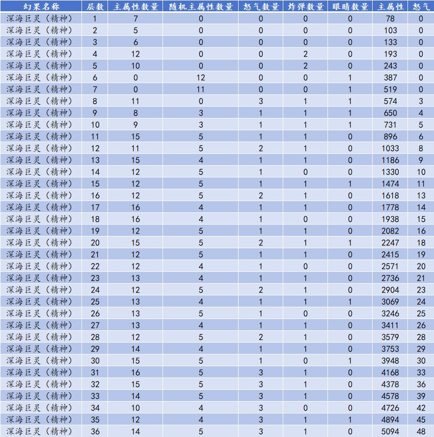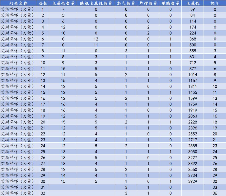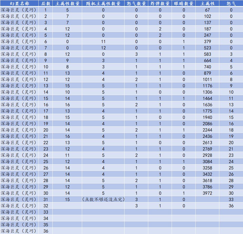 12.9 该更新了…今天终于够协力换了个咩咩,达到30层了,没有数据就说明我自己还没有,嗯。另外建议大家,在上阵幻果点满属性之后,不把多余的点数给未上阵幻果拿图册战力,以升满85级的13%属性比例来说,也远比不上上阵幻果的副属性20%比例,所以还是要给上阵幻果,到这个阶段这些图表就没用了,到时候攒攒把所有主属性和骰子全开了就行,再下一步就是把所有能开的不管什么属性全开了,最后才是考虑未上阵幻果的图册战力。