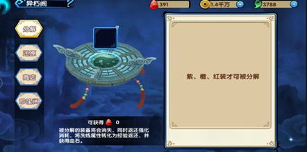 分解可以将紫色品阶以上的装备(包含紫0色)进行分解,玩家可以获得大量的血石。紫色装备相比橙色装备更容易获得,因此建议大家可以使用紫色装备来进行分解,不建议使用橙色和红色装备来进行分解,虽然橙色和红色装备分解所获得的血石相对于紫色装备比较多,但是这两种颜色的装备不易获得尤其是红色装备。宝贵的红色装备可以用来收集集成套装,激活装备套装属性可以增强角色的战斗力。如果大家急需血石在异朽阁兑换装备,而此时背包内又恰好没有紫色装备来进行分解,这时可以使用不需要的橙色装备来进行分解,这样便可以减少装备因分解而无法配全套装的问题,解决无法进行装备升阶从而使战力停滞的问题。只有做到真正的物尽其用,才能获得超强战力。