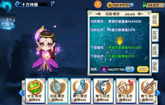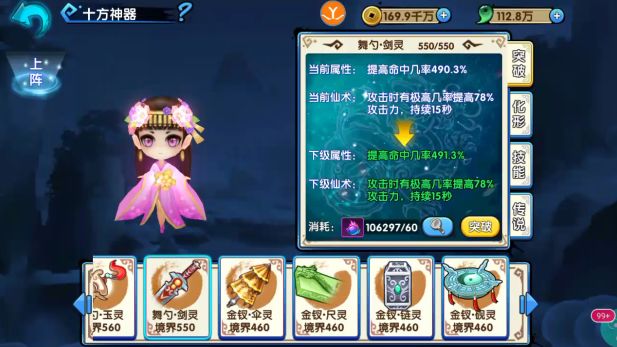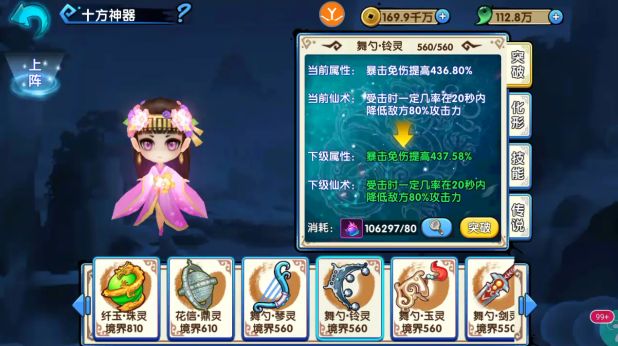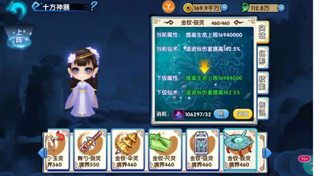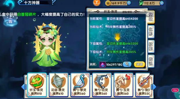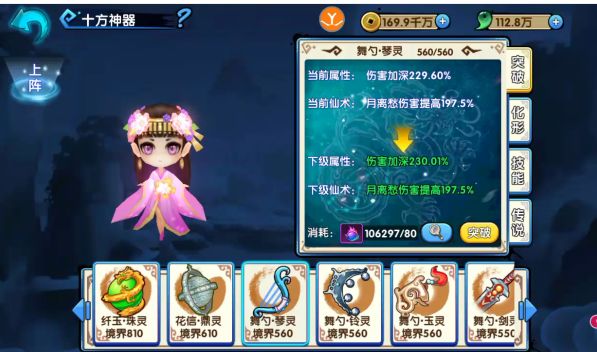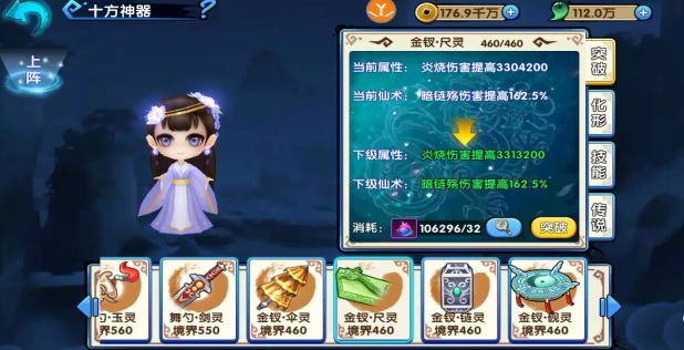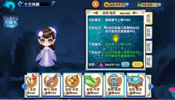 2.神器可通过突破来提升提供角色的属性,且在一定境界会给予角色特殊的强化仙术,比如流光琴境界到10级可以开启角色仙术加成属性,每个神器都有特殊的加成属性。