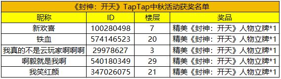 再次恭喜以上获奖的将军大人们,同时也请以上获奖的各位将军在开奖公告发布的10个工作日内,加入《封神:开天》玩家交流群:860840777,并私聊噗噗酱等客服提供tap账号截图信息核对和登记奖品寄送信息。