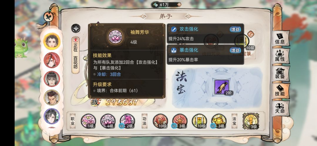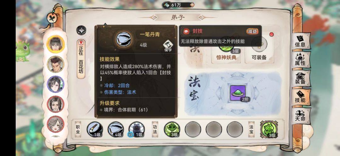 画定位为后排的辅助,技能1:法术伤害,技能2:清除对方buff,技能3:提高全队命中。天命主要是辅助技能。部分功法效果和画的技能效果重复,是可以替换的。个人不太推荐。