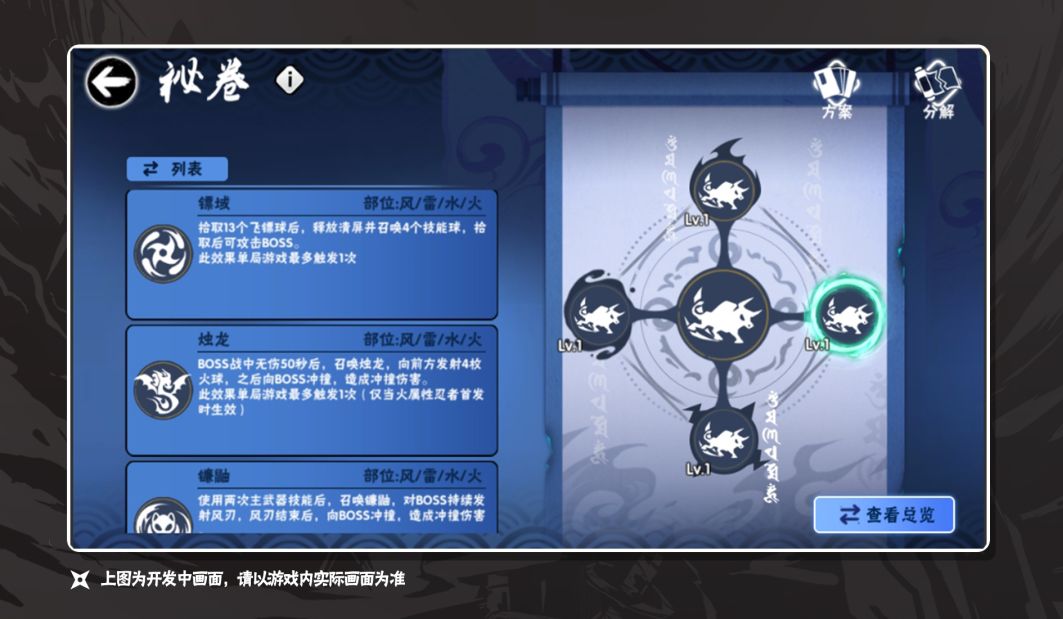 忍忍们可通过四象探秘玩法收集风雷水火四种属性秘卷并装备,为小队中所有忍者带来加成效果。合成对应的秘卷套装可在战斗中触发相应战斗技能。