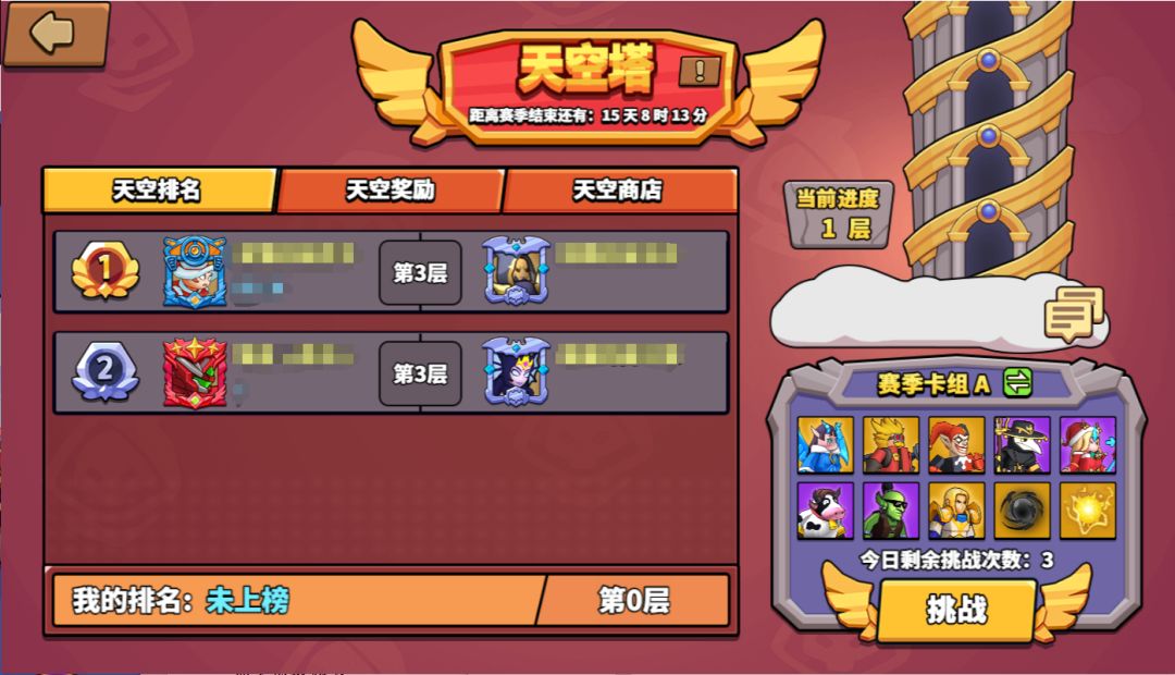 2、天空塔共有40层,玩家需要逐层挑战,首次挑战成功时可获得奖励