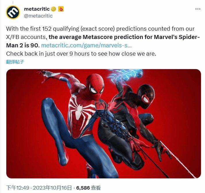 metacritic官方发文表示,根据其X(推特)和脸书账户计算的前152个精准分数预测,《漫威蜘蛛侠2》的MC分数为90分。