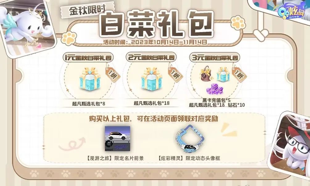10月14日至11月14日期间,超核玩家在商城中购买【金秋限时白菜礼包】后,可在活动页面领取超凡甄选礼包、黑卡充值包、钻石等对应奖励(每份奖励单账号仅限领取1次);购买任意两个限时礼包且登录游戏后可兑换smart合作款-【漫游之旅】限定名片前景;购买1元、2元、3元限时礼包且登录游戏后可兑换smart合作款-【炫彩精灵】限定动态头像框。