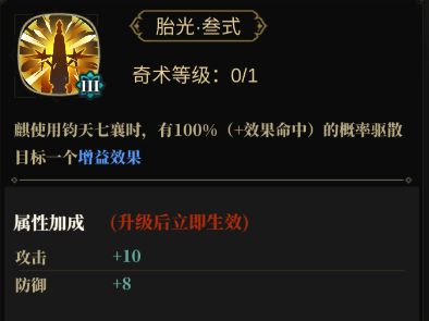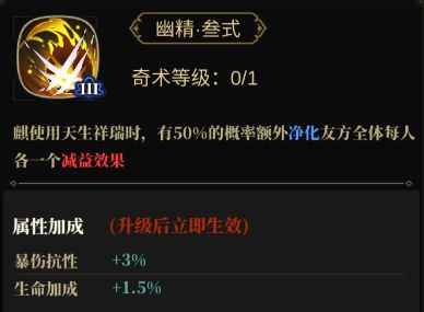 奇术三:开三技能有概率额外净化队友一个减益效果,算是目前环境推荐点的奇术,本身麒目前也是工具人定位。